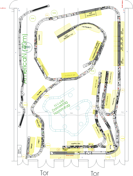 Geplantes Konzept: Zwei Bereiche, einen für mittleren Westen der USA und einen für den Osten der USA. Koppelstelle ist ein Yard, der Pufferaufgaben erhält. Hier findet Lok- und Caboose-Wechsel statt. Also Aufgaben, wie z.B. beim Vorbild Chicago inne hat.