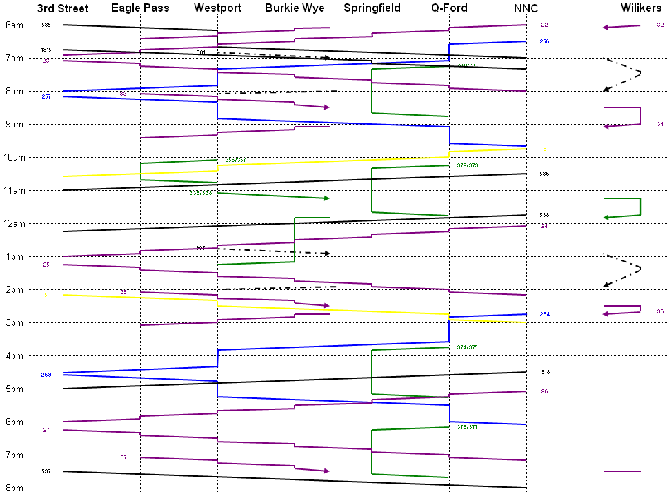 Zwischen den Yards verkehren folgende Züge (paarweise):