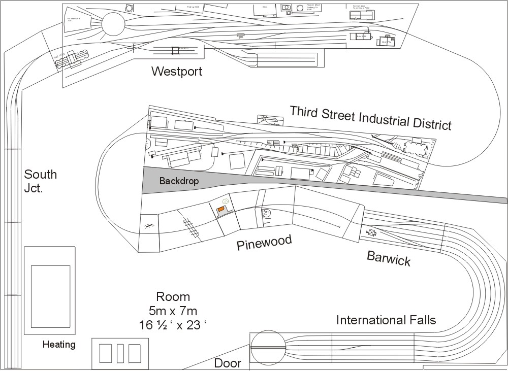 The layout is a point to point walk around style. In this basement room (5m x 7m; 16.4' x 23') are the heater and water in a corner. The trackplan: