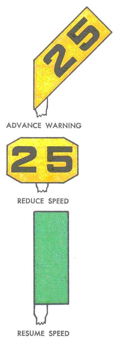 by Advance-warning signs (diagonally upwards), Reduce speed signs
