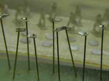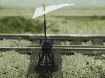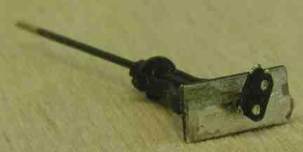 Here's the switch stand and the brass rod. At the first step I use a piece of paper instead target. I glue a 0,3mm steel wire into a hole in the throw bar. The other end of the wire goes into a hole in the tiny brass sheet.